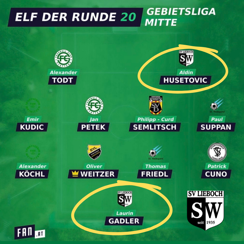 Wir freuen uns außerordentlich mit und für unsere beiden Spieler Laurin Gadler und Aldin Husetovic, die es ins Fan.at‑Team der 20. Runde der Gebietsliga Mitte geschafft haben. Eine tolle Auszeichnung für ihre starken Leistungen!